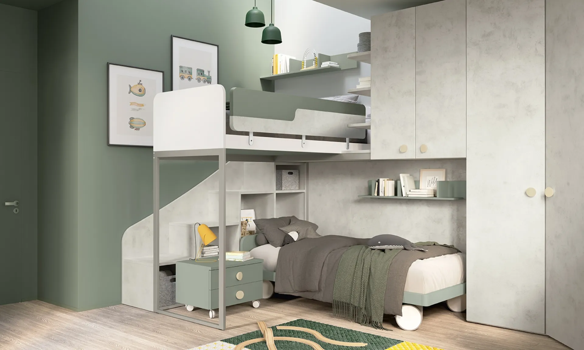 Arreda stanzette moderne con le Camerette a soppalco Colombini Casa! Il modello Golf K49 in melaminico è per bambini.