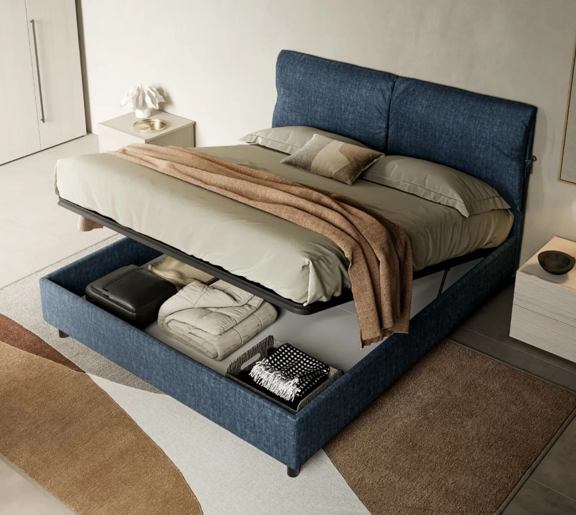 Il letto Taku in tessuto, tra i modelli con contenitore matrimoniali moderni di SantaLucia, è pensato per garantirti il riposo migliore.