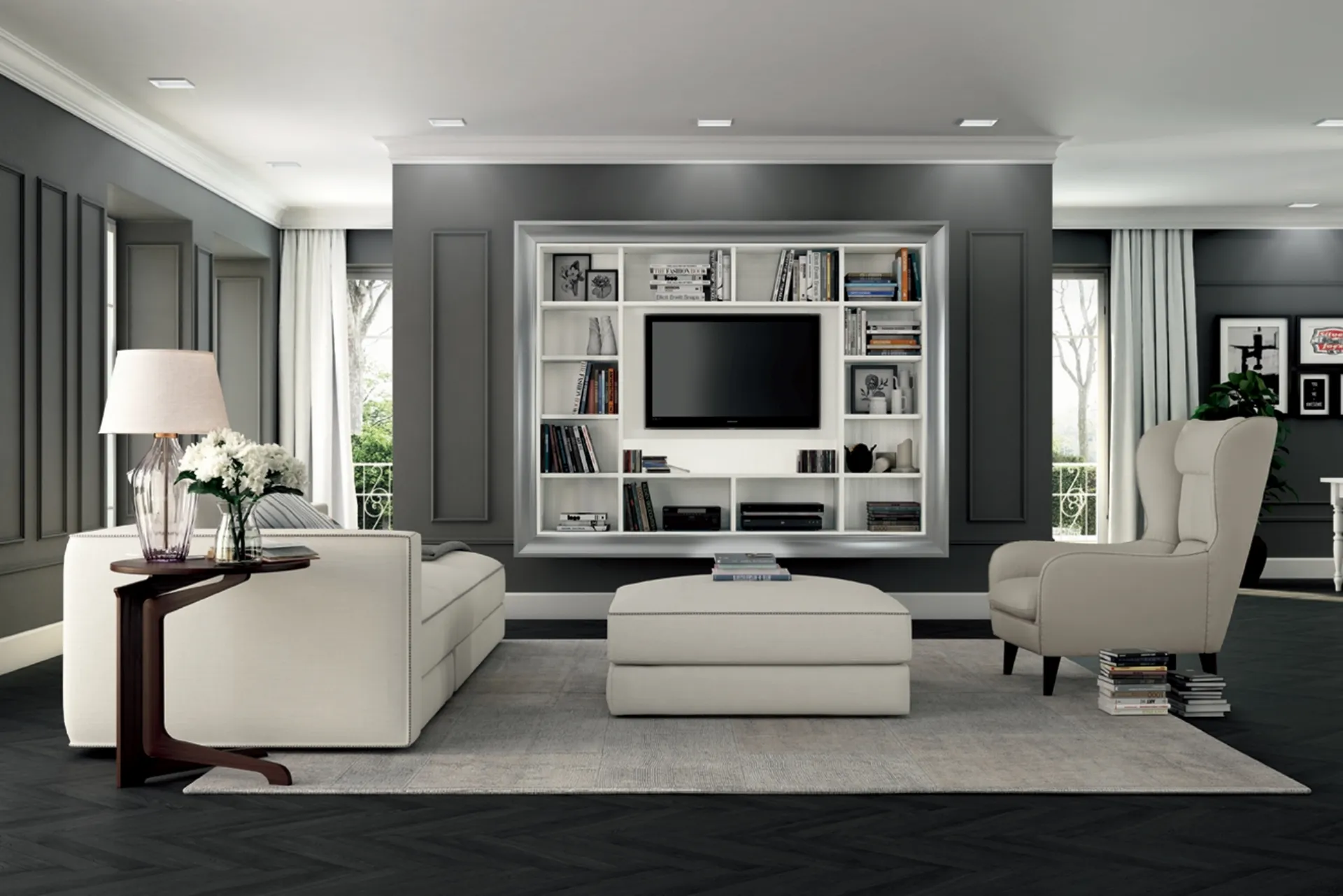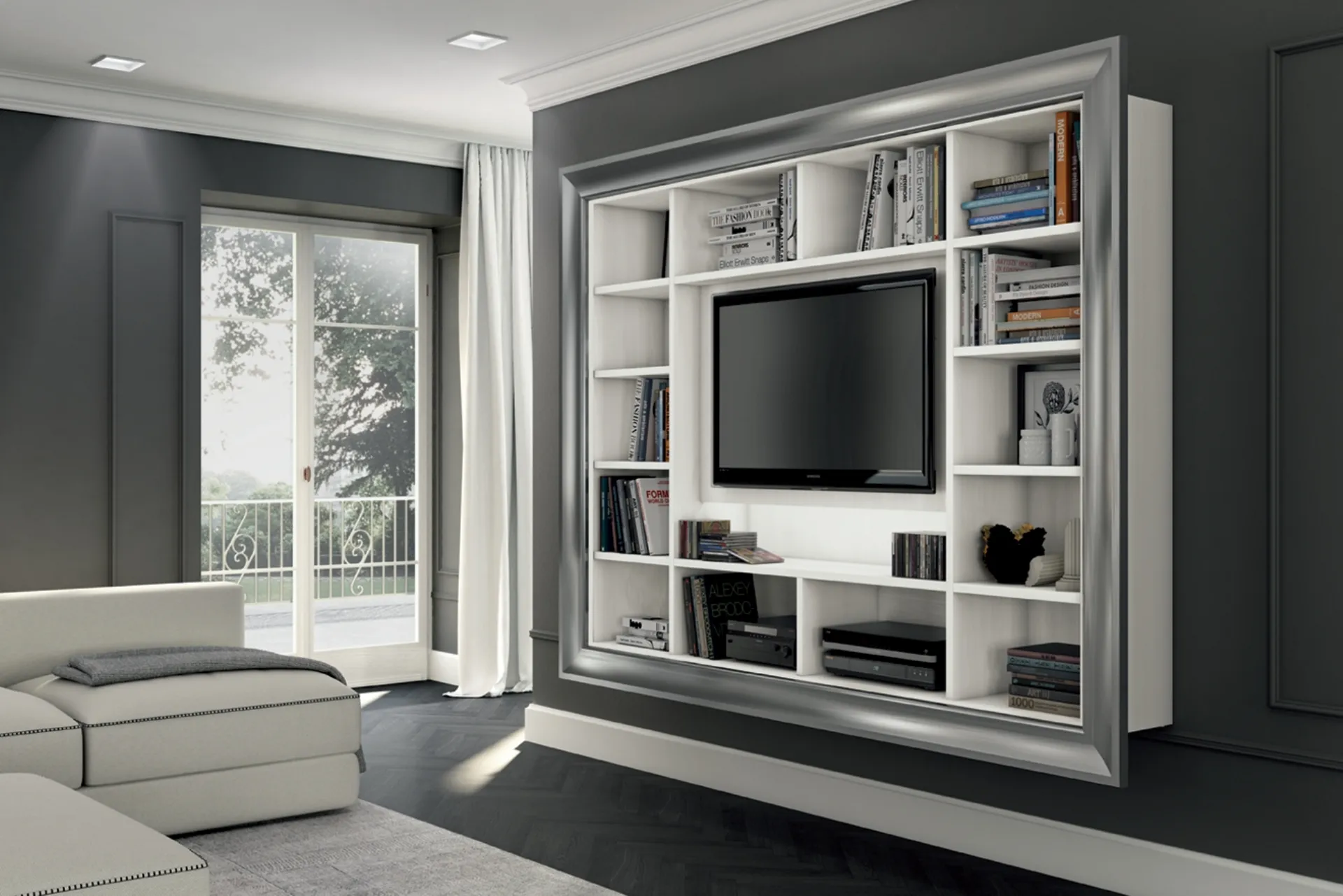 Materiali di pregio e linee decise: scopri la libreria Arcadia AS007 di Colombini Casa tra le più originali Librerie classiche sospese.