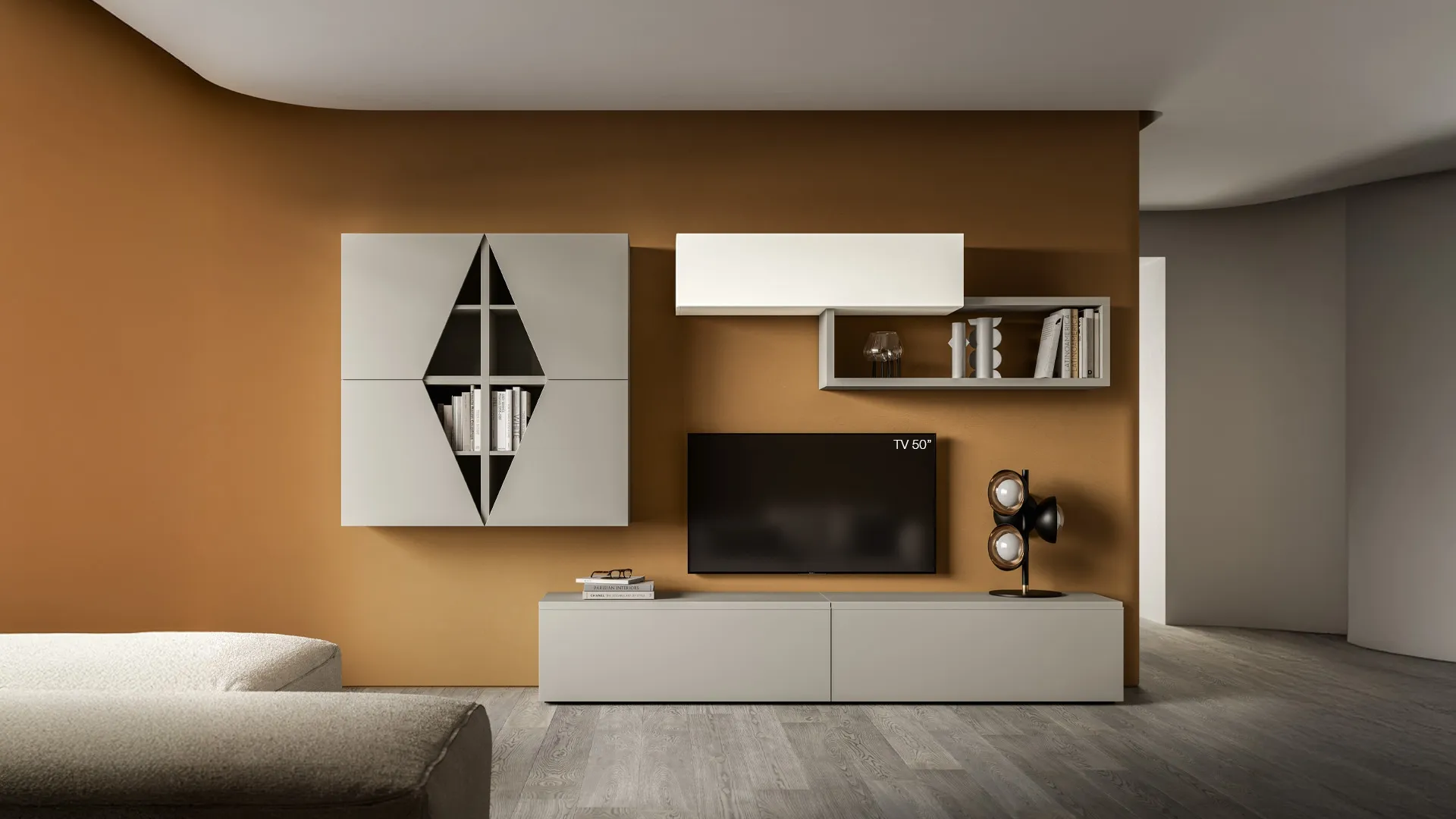 Vuoi progettare un living pratico e operativo? Ti offriamo la parete attrezzata Pratico PTG422 SantaLucia dalle forme decise moderne.