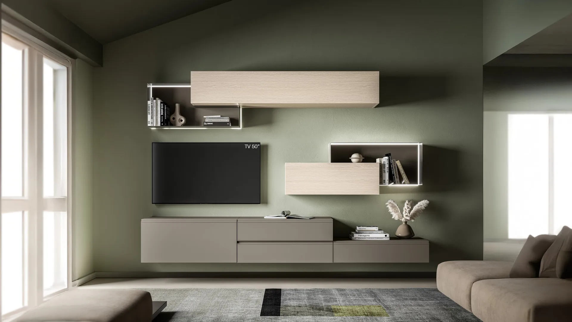 Vuoi arredare un living pratico e dinamico? Ecco a te la parete attrezzata Pratico PTG433 SantaLucia dalle forme decise moderne.